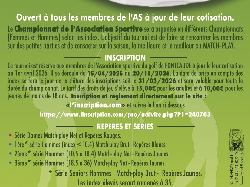 L’édition 2026 du Championnat de Match-Play réservé aux membre AS se déroulera du 15 avril au 20 novembre 2026. C’est le moment de mettre vos compétences de match en jeu et de vous mesurer à… Championnat de Match-Play 2026