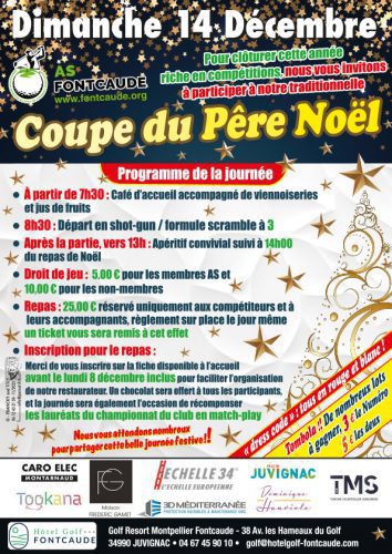 Le repas est strictement réservé aux compétiteurs et à leurs accompagnants. Inscriptions au repas : sur la fiche disponible à l’accueil du golf, jusqu’au 8 décembre inclus.